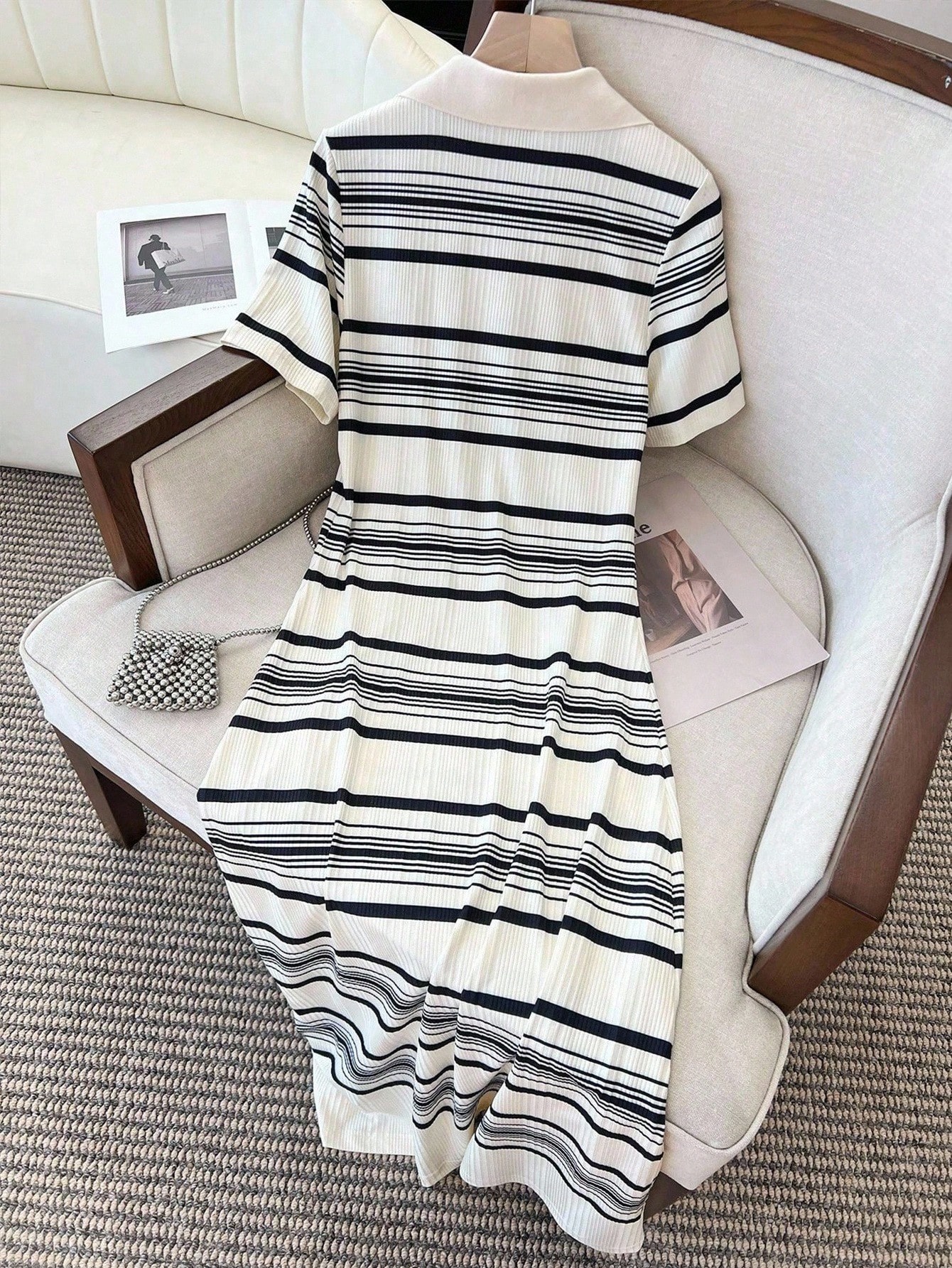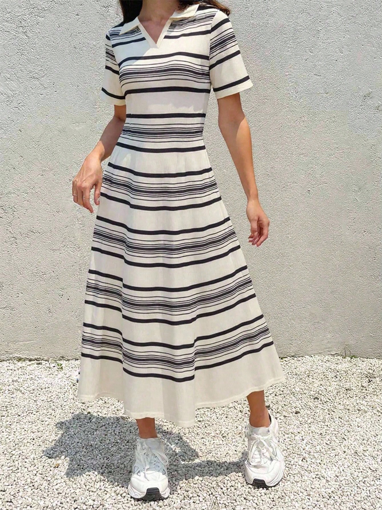 INAWLY فستان كاجوال طويل للنساء بياقة على شكل v وأكمام قصيرة مع خطوط، صيفي